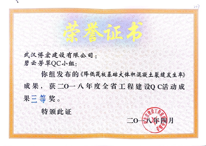 2018年度省建設QC活動成果三等獎(碧云芳草小組)