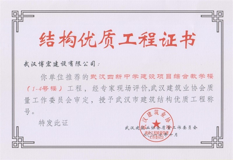 結(jié)構(gòu)優(yōu)質(zhì)工程證書(武漢四新中學綜合教學樓1-4號樓)