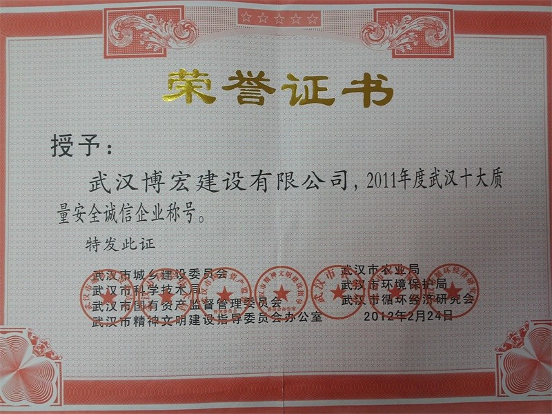 2011年度武漢十大質(zhì)量安全誠(chéng)信企業(yè)稱(chēng)號(hào)