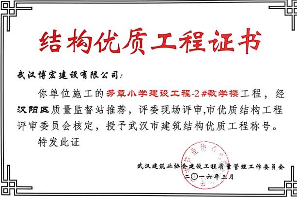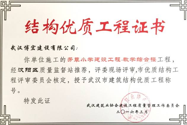 我單位施工的芳草小學建設工程(芳草路與四新北路交匯處西北角)1#教學樓、2#教學樓、教學綜合樓工程,經(jīng)漢陽區(qū)建筑管理站推薦,評委現(xiàn)場評審,武漢建筑業(yè)協(xié)會建設工程質(zhì)量管理工作委員會核定,授予武漢市建筑結構優(yōu)質(zhì)工程稱號。