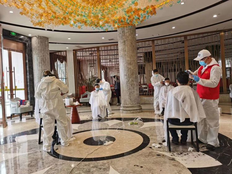 目前正值疫情防控決戰(zhàn)階段,為了確保整個理發(fā)過程安全有序,此次理發(fā)活動選在公司防疫項目建設(shè)人員集中居住的紐賓凱大酒店,志愿者們均由公司指派專人開車提前1個小時從漢陽、漢口接至酒店,進(jìn)入大堂之前,所有人員均進(jìn)行了體溫檢測,并分發(fā)口罩,理發(fā)開始后則按照每四人一組進(jìn)行輪換理發(fā),避免人員集中。整個理發(fā)過程持續(xù)了近4個小時,在4位理發(fā)師的精心打理下,70余名項目一線人員從“油膩大叔”秒變“帥氣小伙”。