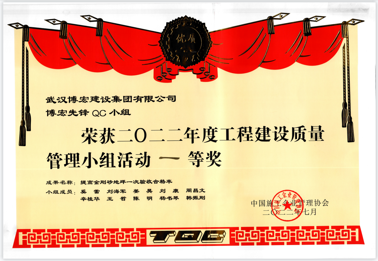 近日,由中國施工企業(yè)管理協(xié)會(huì)主辦的“2022年工程建設(shè)質(zhì)量管理小組競賽活動(dòng)復(fù)賽和決賽”已圓滿結(jié)束,由我司報(bào)送的4項(xiàng)成果經(jīng)歷層層角逐,在全國1113個(gè)成果中脫穎而出。其中博宏先鋒QC小組的代表成果《提高金剛砂地坪一次驗(yàn)收合格率》榮獲一等獎(jiǎng)、芳草云天QC小組的代表成果《地下室外墻單側(cè)支模體系研制》與鸚鵡晴川QC小組的代表成果《提高疊合板施工一次驗(yàn)收合格率》榮獲二等獎(jiǎng)、博宏機(jī)電之星QC小組的代表成果《提高消防噴淋頭安裝定位準(zhǔn)確率》榮獲三等獎(jiǎng),博宏建設(shè)集團(tuán)QC成果再次取得重大突破!