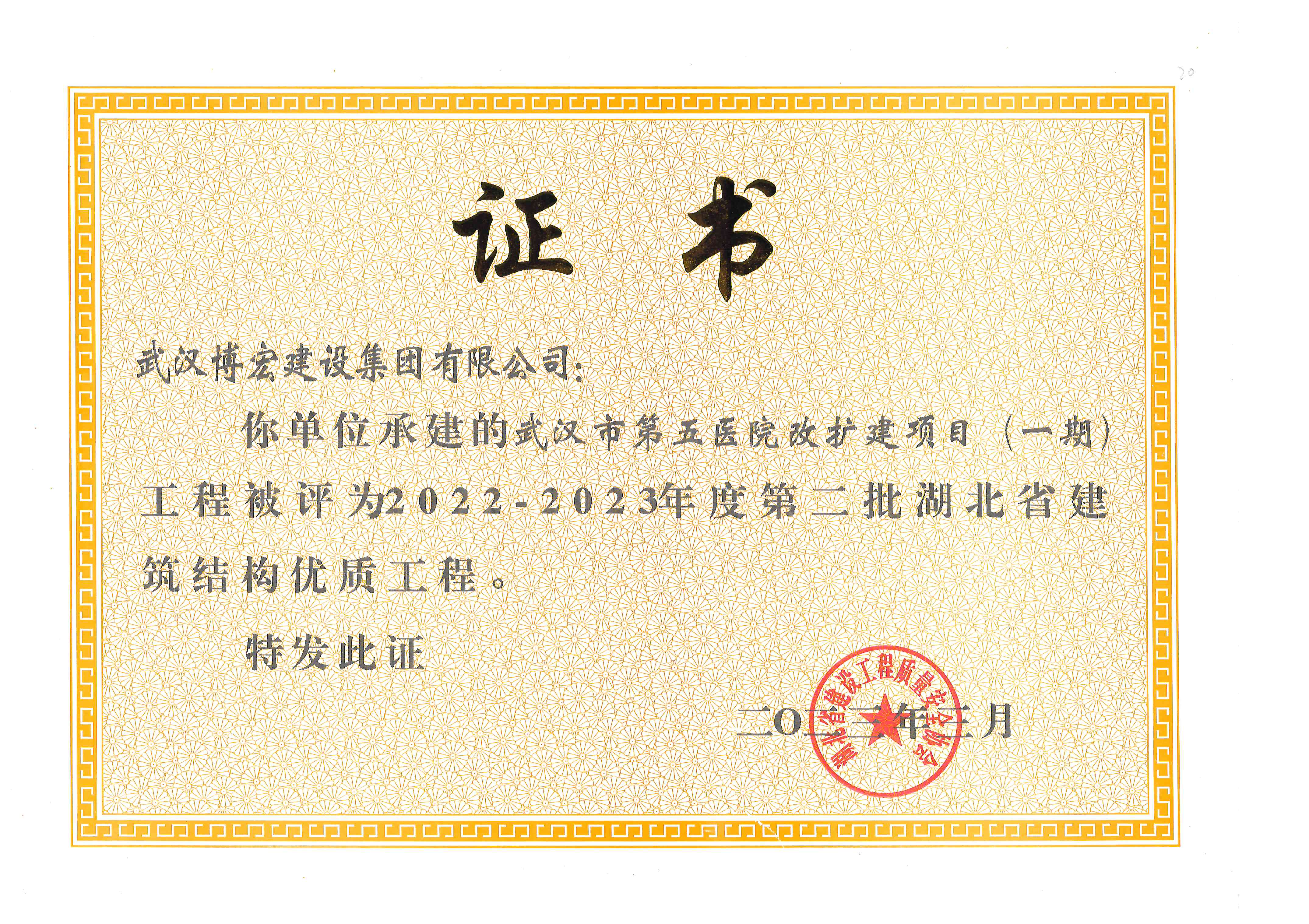 近日,湖北省住建廳2022—2023年度第二批湖北省建筑結(jié)構(gòu)優(yōu)質(zhì)工程項目名單出爐,由博宏建設(shè)集團(tuán)承建的武漢市第五醫(yī)院改擴(kuò)建項目(一期)、新建居住項目(長投·長河九里一期)(二標(biāo)段)3#、5#樓榮獲湖北省建筑結(jié)構(gòu)優(yōu)質(zhì)工程獎。“湖北省建筑結(jié)構(gòu)優(yōu)質(zhì)工程獎”是湖北省建筑結(jié)構(gòu)工程領(lǐng)域的最高獎項,獲得該獎項標(biāo)志著該項目在工程結(jié)構(gòu)設(shè)計、工程施工管理、材料供應(yīng)保證、過程質(zhì)量控制等方面均達(dá)到省級領(lǐng)先水平。